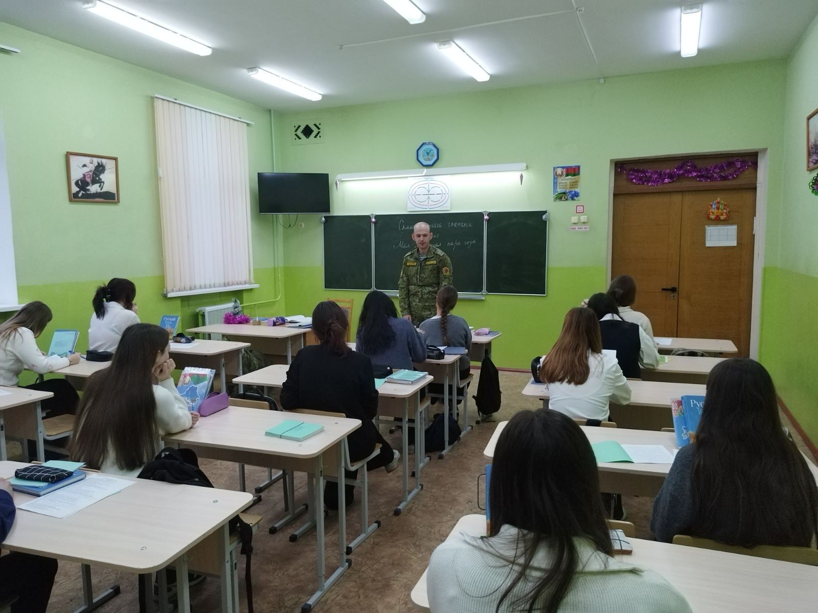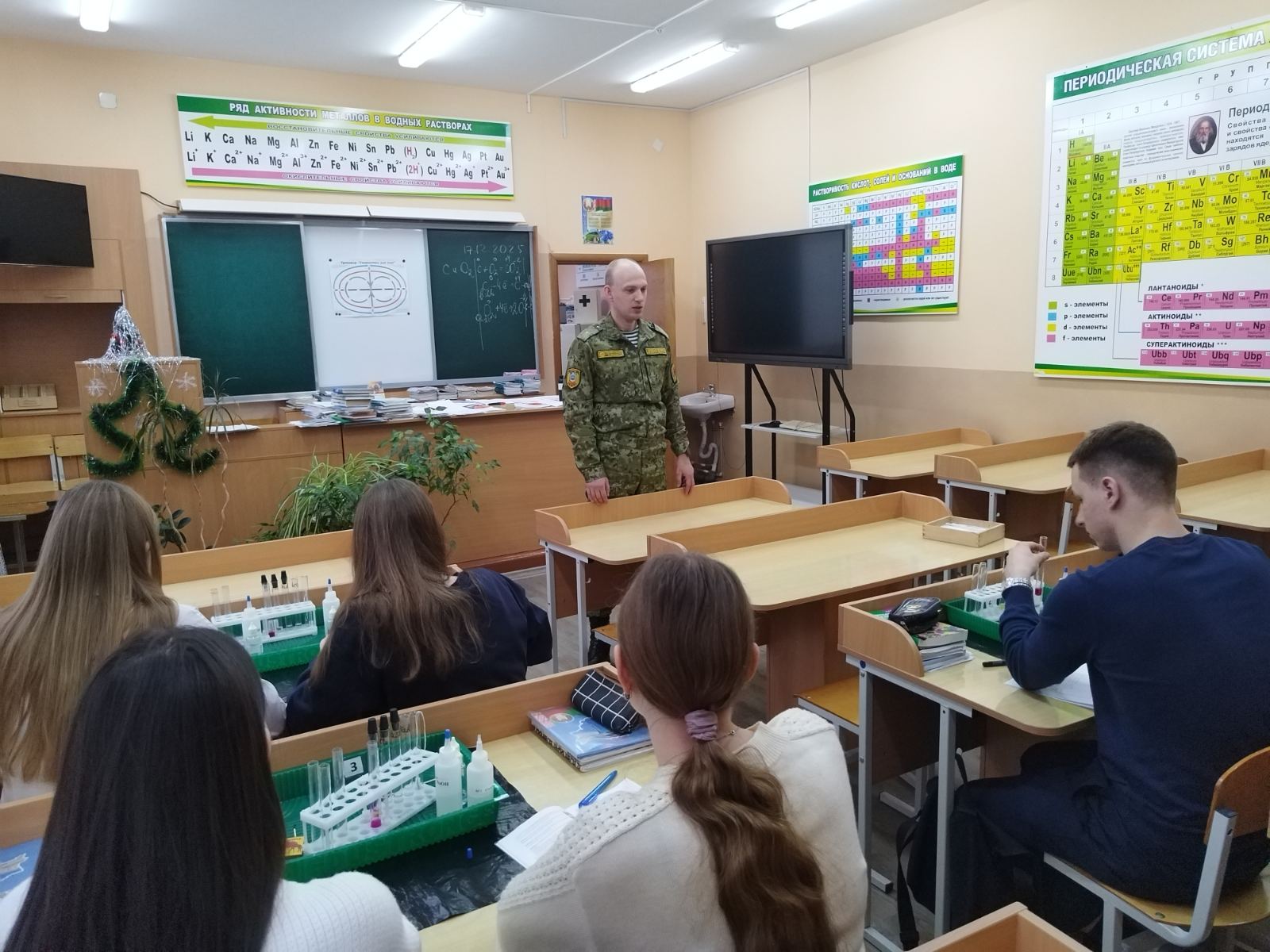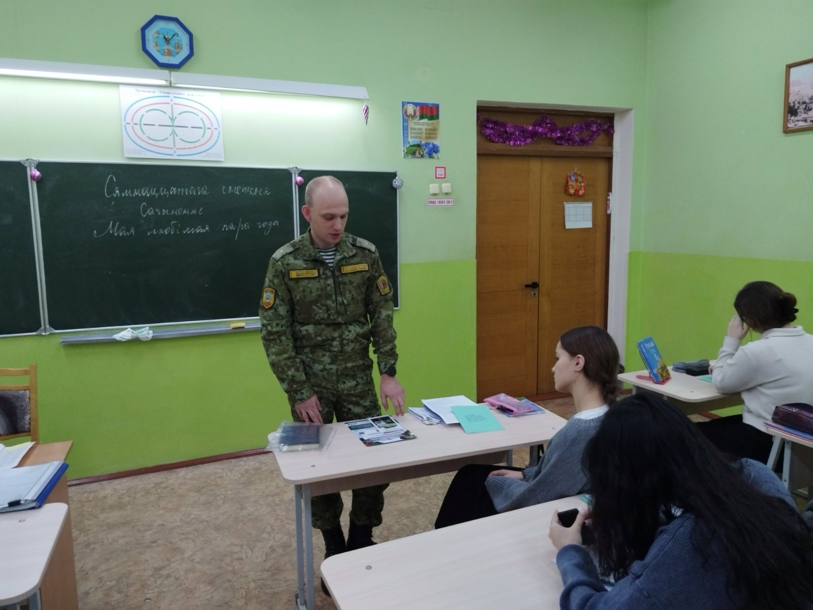 17.12.2025 в ГУО «Средняя школа — 3 г.Витебска имени Л.Н.Белицкого» состоялась встреча учащихся 11 класса с представителем Полоцкого пограничного отряда. В ходе встречи ребята ознакомились со спецификой работы указанного подразделения, сроками и условиями поступления в ВУЗы Министерства обороны Республики Беларусь, порядком прохождения службы после завершения обучения, а также о социальном и ином обеспечении военнослужащих.