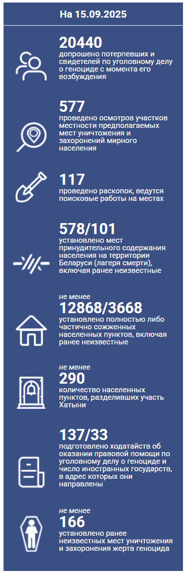 В рамках расследования уголовного дела с апреля 2021 года по республике допрошено свыше 16 тысяч человек, из них более 2,5 тысяч в Витебской области. Среди них более половины – это узники лагерей смерти, их родственники, иные свидетели и очевидцы злодеяний немецко-фашистских захватчиков и коллаборационистов. Большинство допросов записано на видео. Проведено свыше 5 тысяч осмотров архивных документов, мест массового уничтожения и захоронения мирных граждан, сельских населенных пунктов.