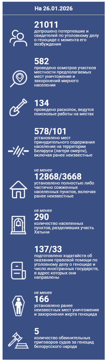 В целях сохранения социальной и исторической справедливости, устранения белых пятен истории, укрепления конституционного строя и национальной безопасности в марте 2021 г. Генеральным прокурором Республики Беларусь возбуждено и расследуется уголовное дело по факту совершения нацистскими преступниками, их пособниками, националистическими формированиями в ходе Великой Отечественной войны и в послевоенный период на территории БССР и других государств геноцида белорусского народа. Справочно.