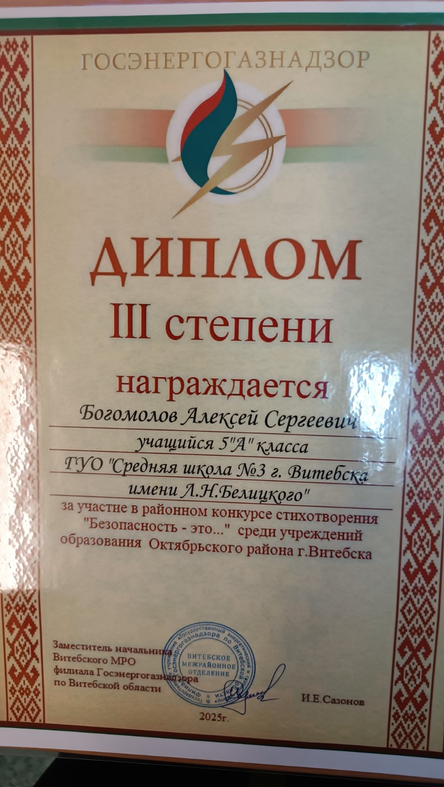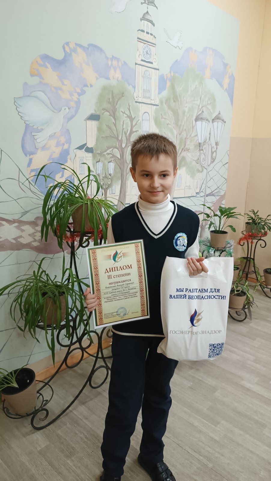 08.12.2025Учащиеся школы приняли участие в районном конкурсе стихотворений «Безопасность — это….», инициированным Витебским межрайонным отделением филиала государственного учреждения «Государственный энергетический и газовый надзор» по Витебской области. Дипломом III степени отмечена работа учащегося 5″А» класса Богомолова Алексея, призами были поощрены учащиеся Германьев Станислав, 8″Б» и Акимченков Олег, 6″В». Поздравляем победителя и участников конкурса!